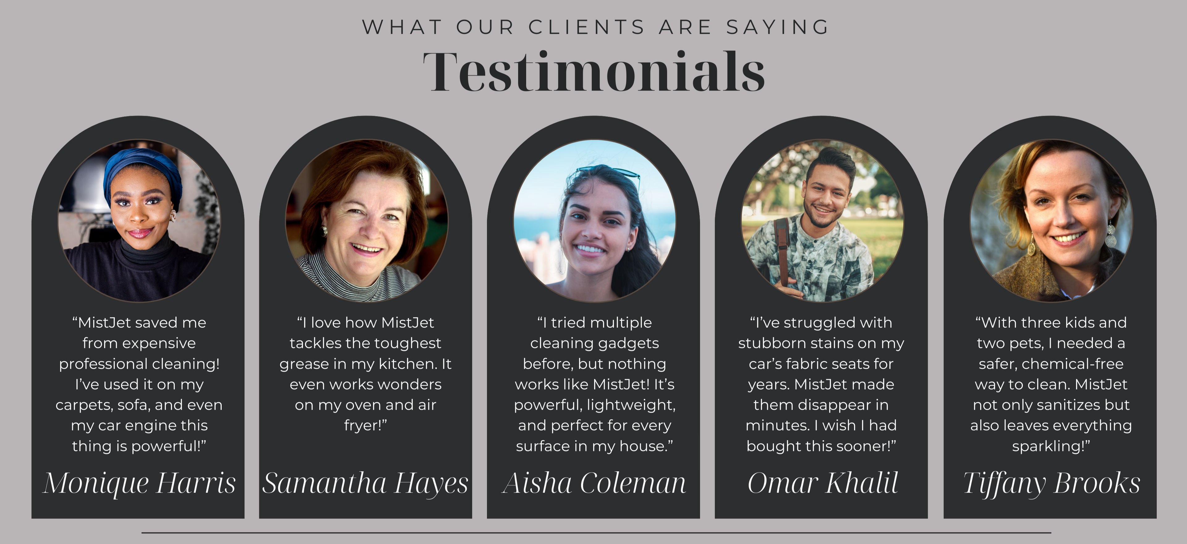 ⭐️⭐️⭐️⭐️⭐️ "I used to spend hours scrubbing my stove and shower tiles. Now, MistJet does it in minutes!" - Emily T.